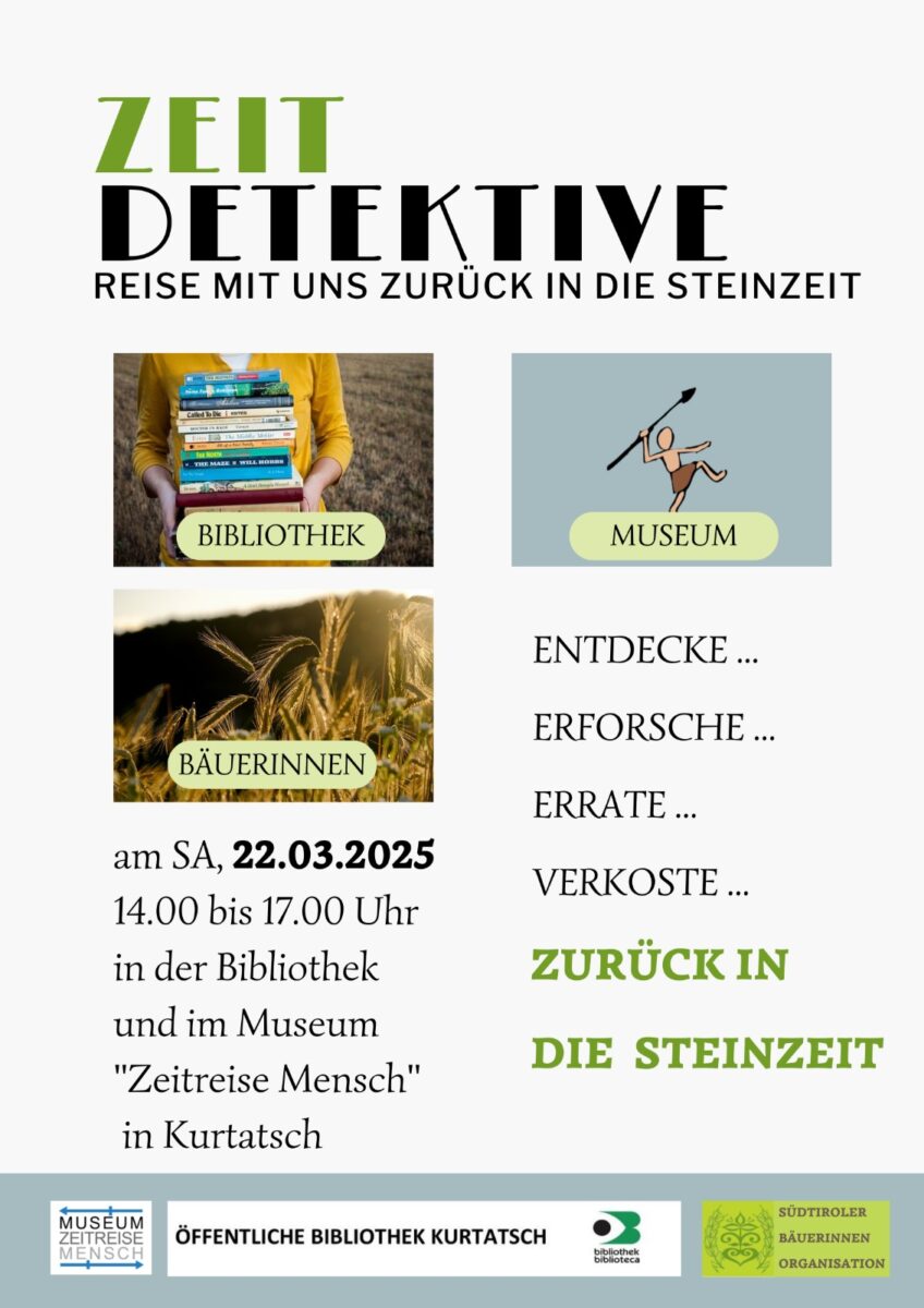 Am Samstag, dem 22. März 2025 findet von 14.00 bis 17.00 Uhr der Workshop Zeitdetektive statt, der sich an Kinder, Jugendliche und Familien richtet. Organisiert wird der Nachmittag vom Museum Zeitreise Mensch, der Bibliothek Kurtatsch und der SBO Ortsgruppe Kurtatsch.